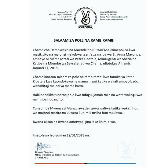 Wakili msomi Peter Kibatala ambaye pia ni mwanachama wa Chama Cha Demokrasia na Mkurugenzi wa Sheria na Katiba Maendeleo (CHADEMA) amepata pigo baada ya kumpoteza mama yake mzazi Bi. Anna Mayunga ambaye amefariki jana