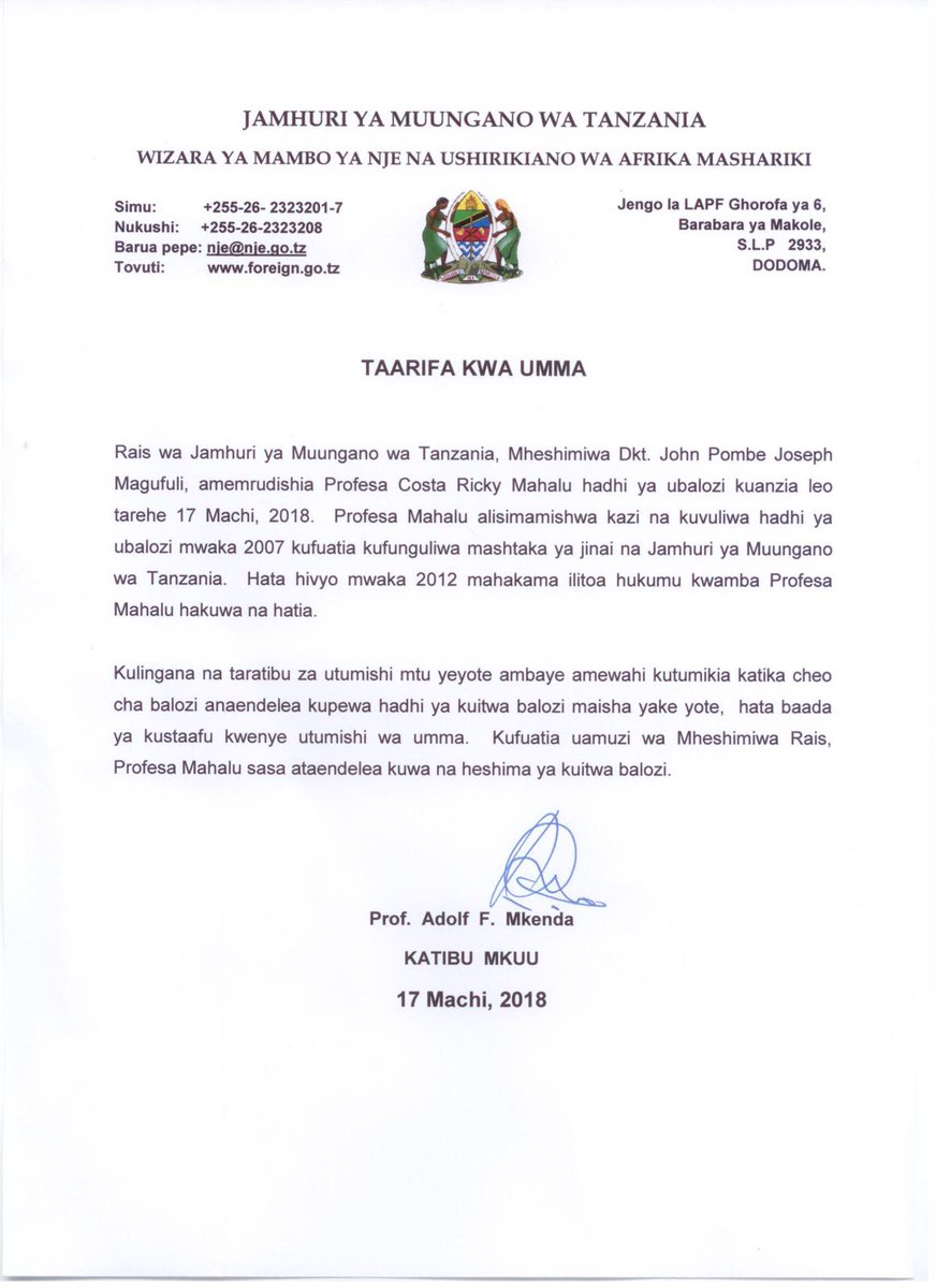 Rais Magufuli amemrudishia Prof. Costa Ricky Mahalu hadhi yake ya Ubalozi.
