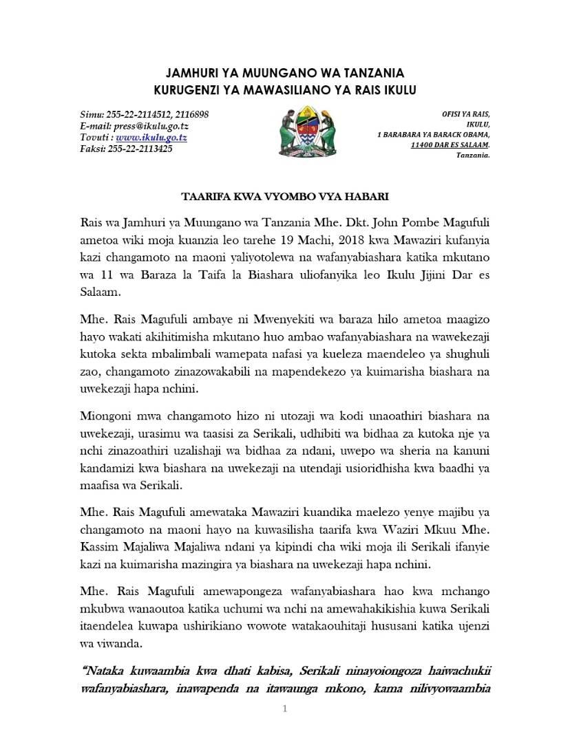 Rais Magufuli atoa wiki Moja kwa Mawaziri wake